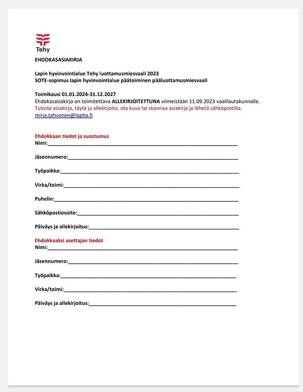 Ehdokasasiakirjan pohja on tämän kirjeen liitteenä.