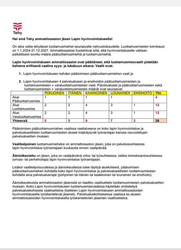 Vaalikelpoinen luottamusmieheksi on ammattiosaston jäsen, joka on palvelussuhteessa lapin hyvinvointialue työnantajaan kuukautta ennen vaalipäivää.