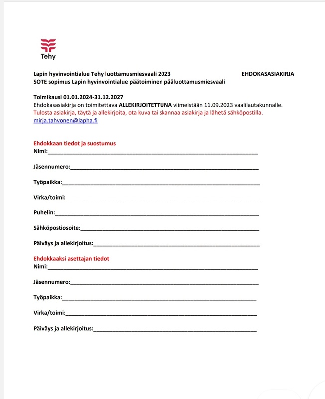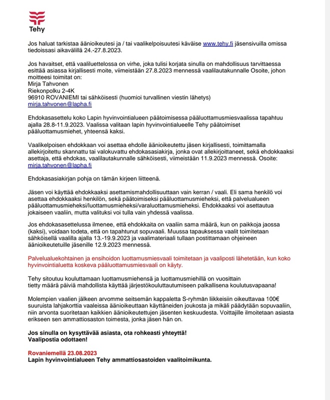 Ehdokasasettelu koko Lapin hyvinvointialueen päätoimisessa pääluottamusmiesvaalissa tapahtuu ajalla 28.8-11.9.2023. Vaalissa valitaan lapin hyvinvointialueelle Tehy päätoimiset pääluottamusmiehet, yhteensä kaksi.